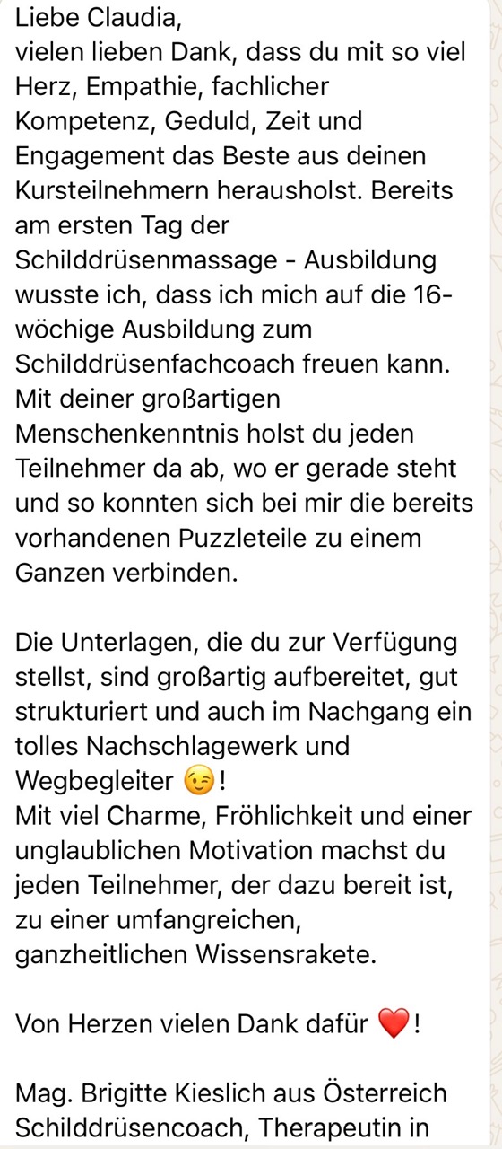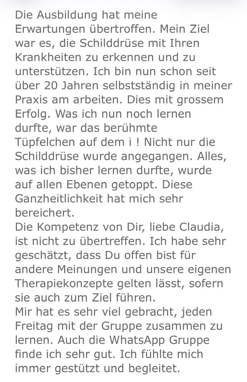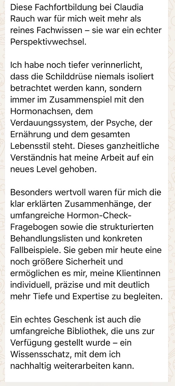 Außerdem bilde ich als Dozentin und Ausbilderin gemeinsam mit Dr. Berndt Rieger als Hormoniezentrum für Bayern Therapeuten, Coaches und auch Patienten aus – fundiert, praxisnah und mit klarem roten Faden.